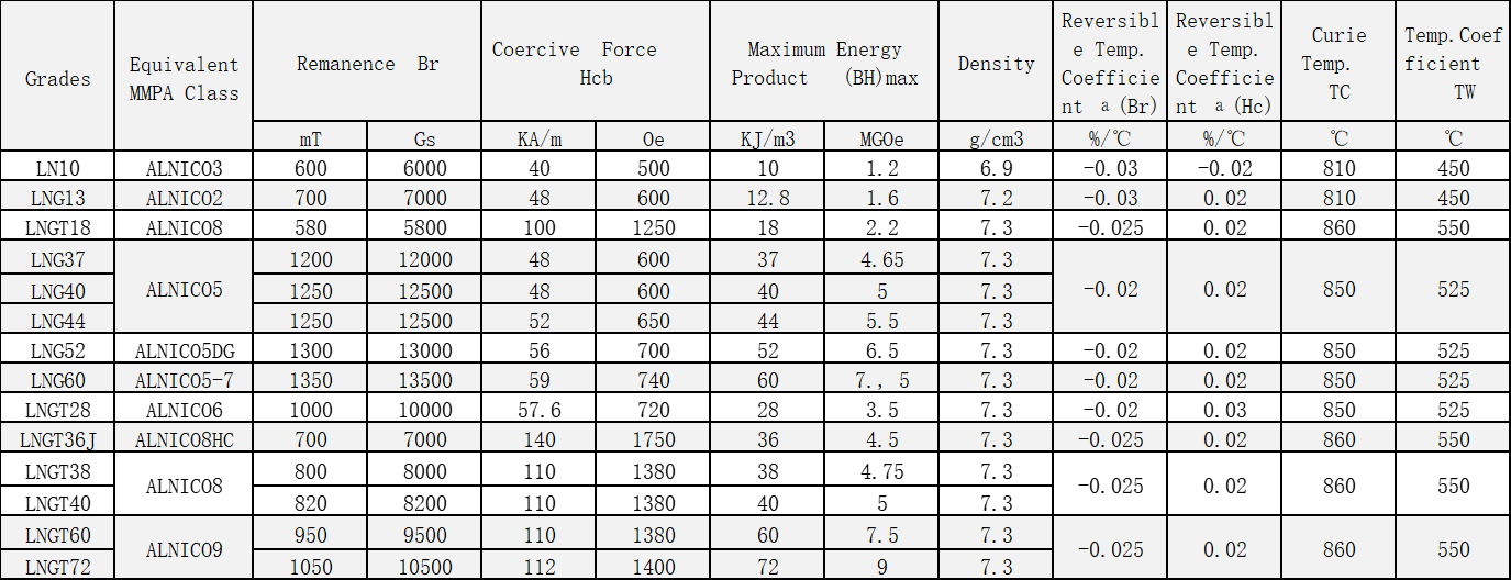 | LNGT38 | ALNICO8 | 800 | 8000 | 110 | 1380 | 38 | 4.75 | 7.3 | -0.025 | 0.02 | 860 | 550 |