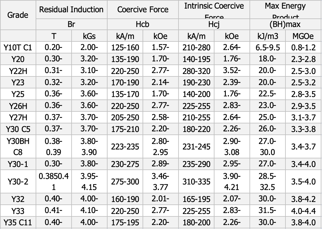 | Grade | Residual Induction | Coercive Force | Intrinsic Coercive Force | Max Energy Product | ||||