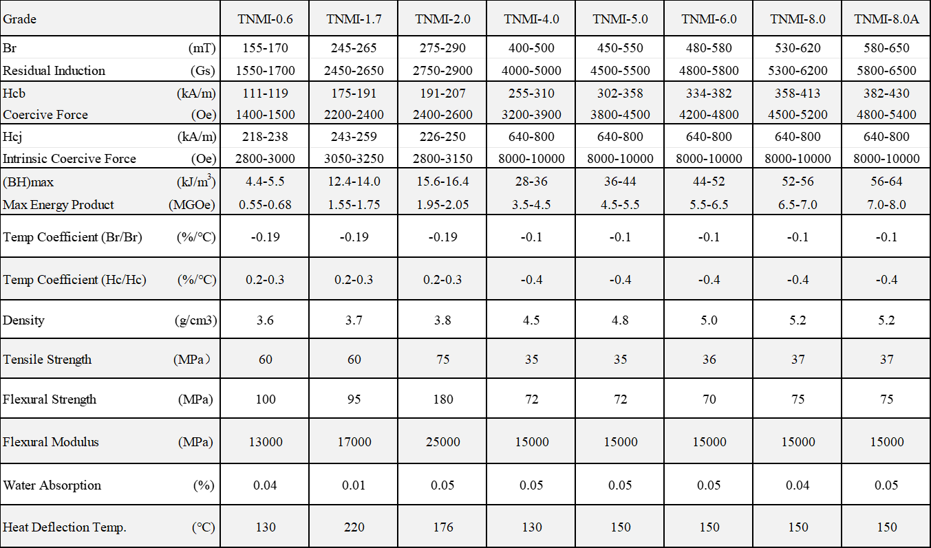 | Maximum Energy Product (BH)max (kJ/m³) | 4.4-5.5 | 12.4-14.0 | 15.6-16.4 | 28-36 | 36-44 | 44-52 | 52-56 | 56-64 |