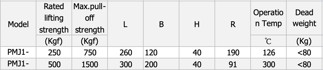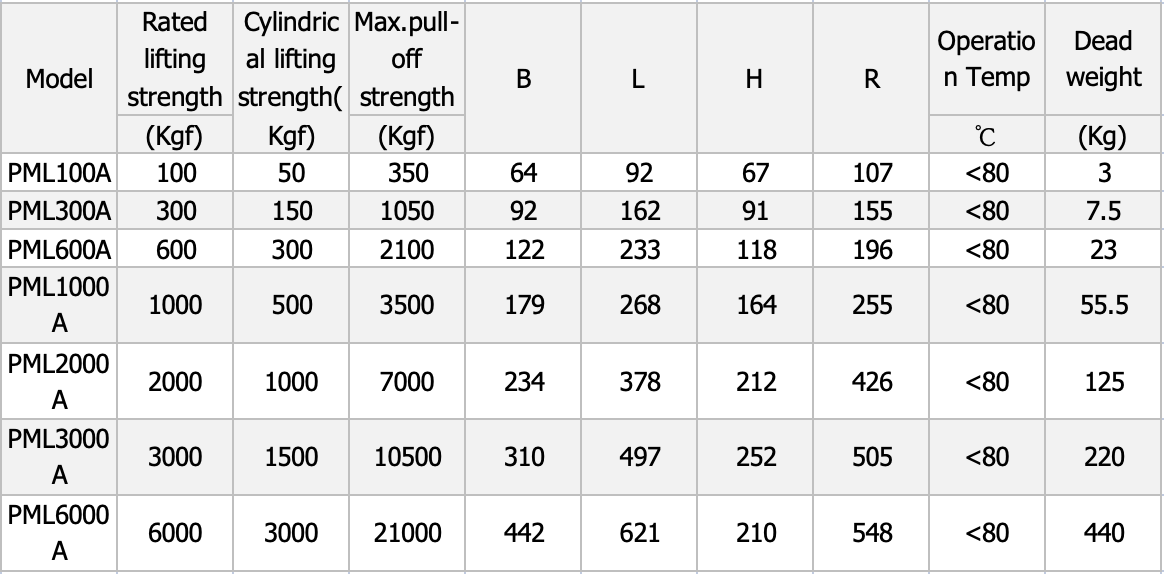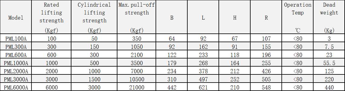 | Model | Rated lifting strength | Cylindrical lifting strength(Kgf) | Max.pull-off strength | B | L | H | R | Operation Temp | Dead weight |