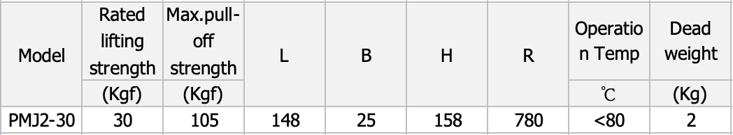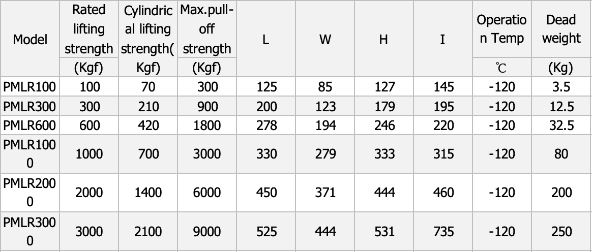| Model | Rated lifting strength | Cylindrical lifting strength(Kgf) | Max.pull-off strength | L | W | H | I | Operation Temp | Dead weight |
