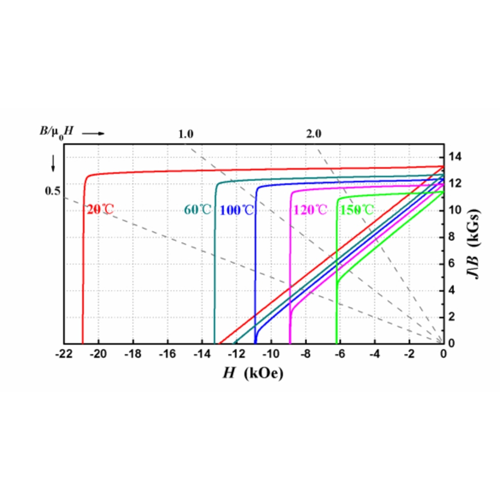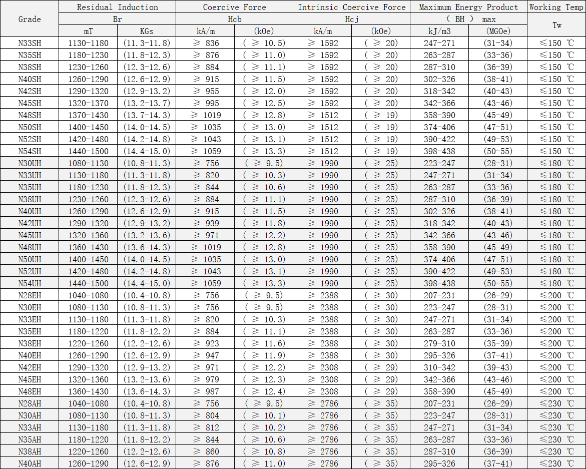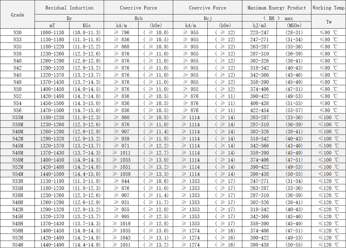 | Grade | Residual Induction | Coercive Force | Intrinsic Coercive Force | Maximum Energy Product | Working Temp | ||||