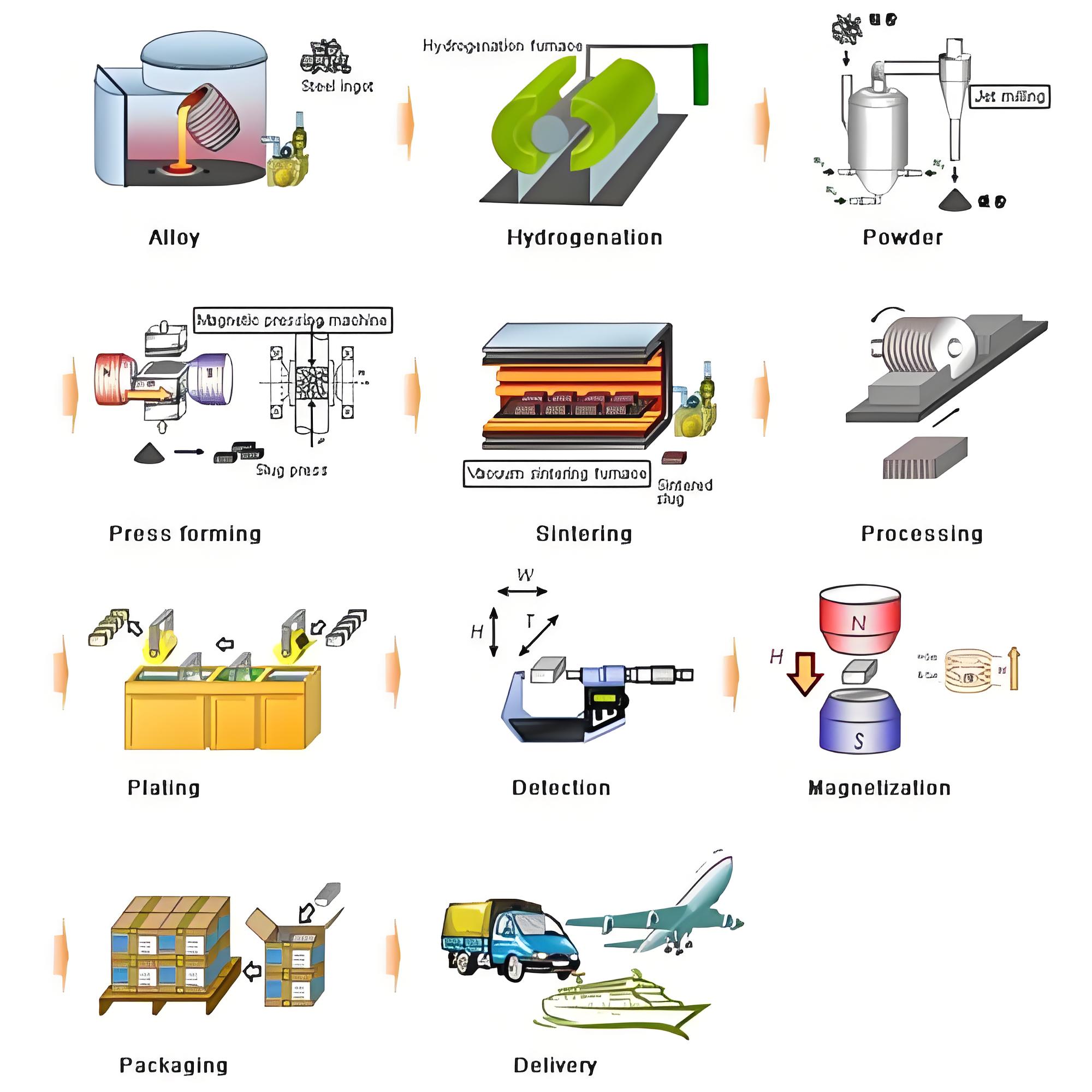Sintered NdFeB magnets originated in 1983 and are currently among the highest-performance magnetic materials available. Due to their susceptibility to oxidation, surface anti-corrosion coatings are typically applied, such as zinc, nickel-copper-nickel, chromium, or epoxy. With excellent machinability, they can be manufactured into various shapes and sizes according to customer requirements.