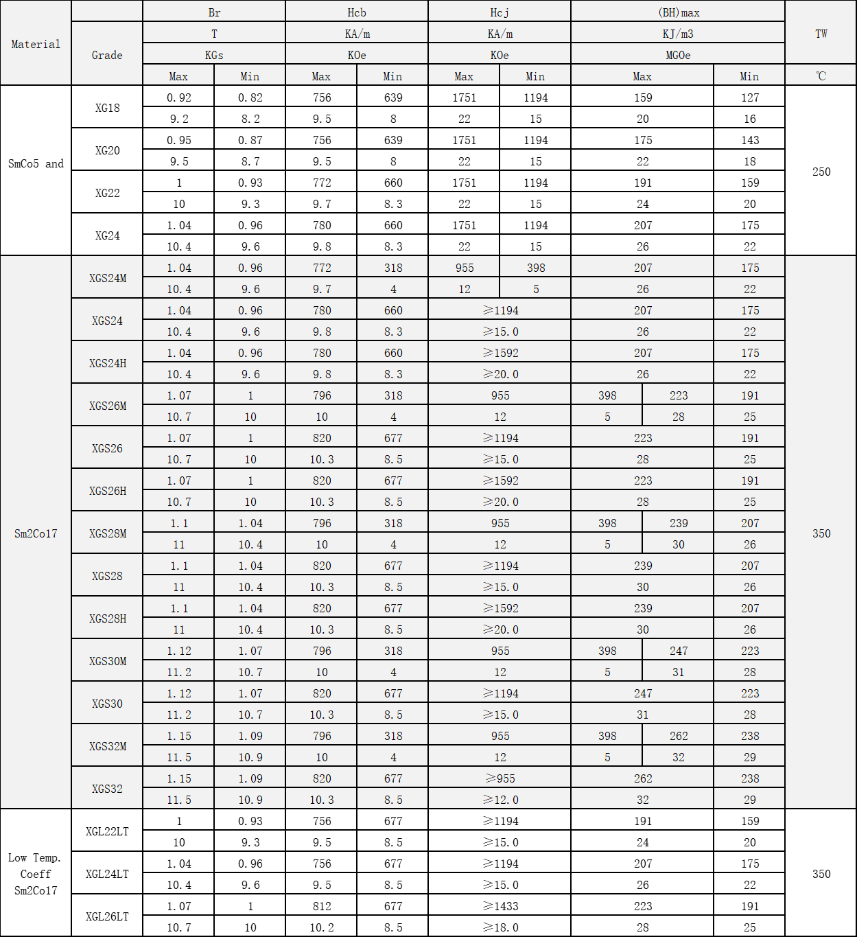 | Sm2Co17 | XGS24M | 1.04 | 0.96 | 772 | 318 | 955 | 398 | 207 | 175 | 350 | |